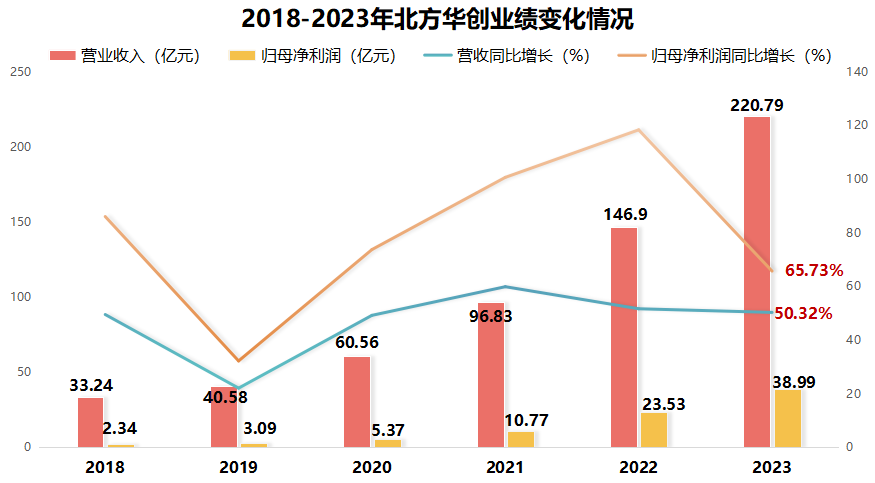 而这也不是北方华创的超常发挥,近几年基本都是这个速度。2018-2023年,公司营收从33.24亿元增长到220.79亿元,年复合增速46.03%,净利润从2.34亿元增长到38.99亿元,年复合增速高达75.53%。