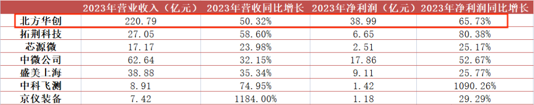 其中,最引人注目的无疑是老大哥北方华创,2023年营收同比增长50.32%,净利润同比增长65.73%,都在行业前列,还是业绩基数本来就大的前提下。