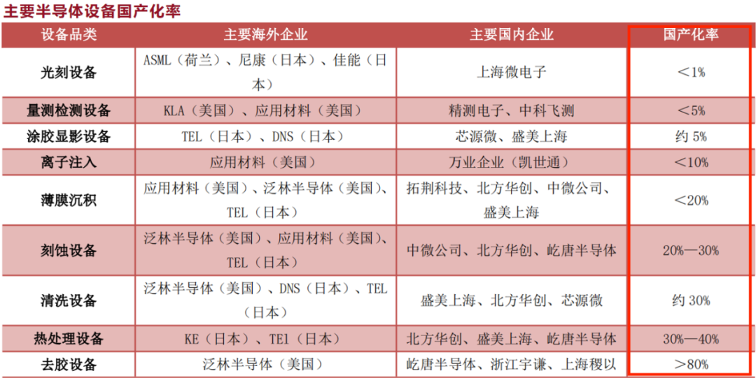 即使国内半导体设备公司每年的营收持续高增,国产化率仍然是不高的,除了去胶设备国产化率大于80%,其他基本都在30%以下,意味着国内厂商仍有着巨大的国产替代空间。