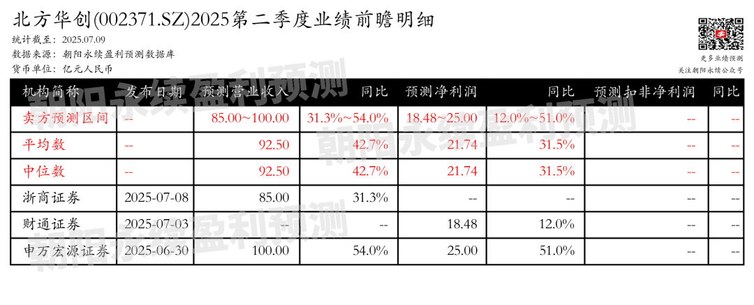 截至2025年07月09日,根据朝阳永续季度业绩前瞻数据: