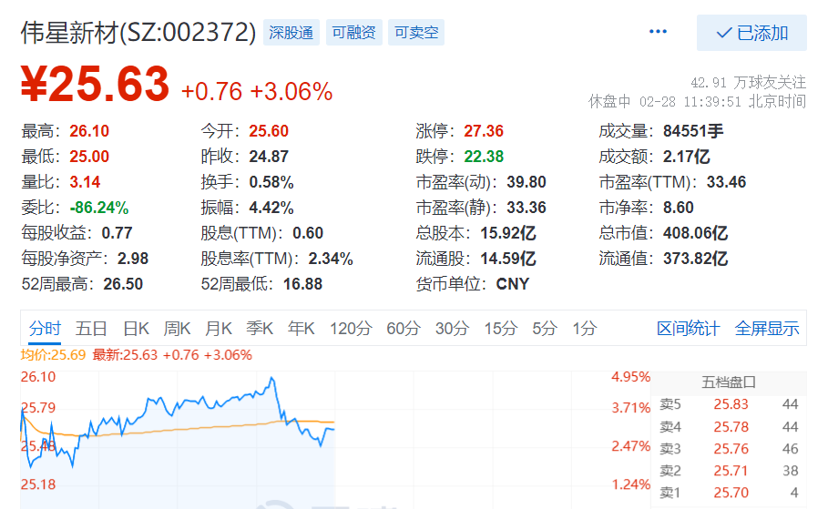 截至2月28日午间收盘,伟星新材股价涨3.06%,报25.63元,总市值为408.06亿元。