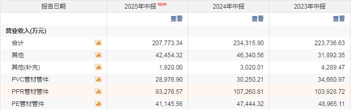 从伟星新材的核心业务经营来看,PPR、PE、PVC三大管材系列营业收入分别下降至9.33亿元、4.11亿元和2.90亿元。