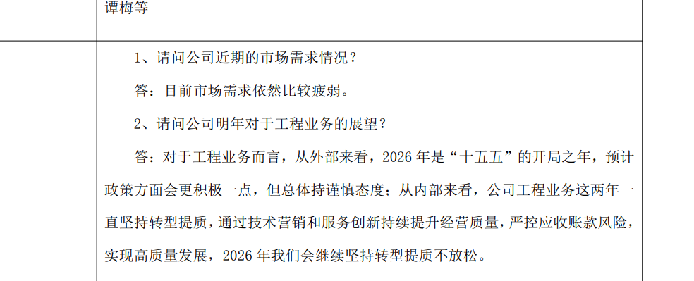 对于投资者关心的2026年工程业务展望,公司展现出谨慎态度。从内部来看,公司工程业务这两年一直坚持转型提质,通过技术营销和服务创新持续提升经营质量,严控应收账款风险,实现高质量发展,2026年我们会继续坚持转型提质不放松。