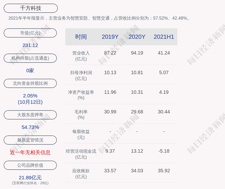 2021年半年报显示,千方科技的主营业务为智慧安防、智慧交通,占营收比例分别为:57.52%、42.48%。