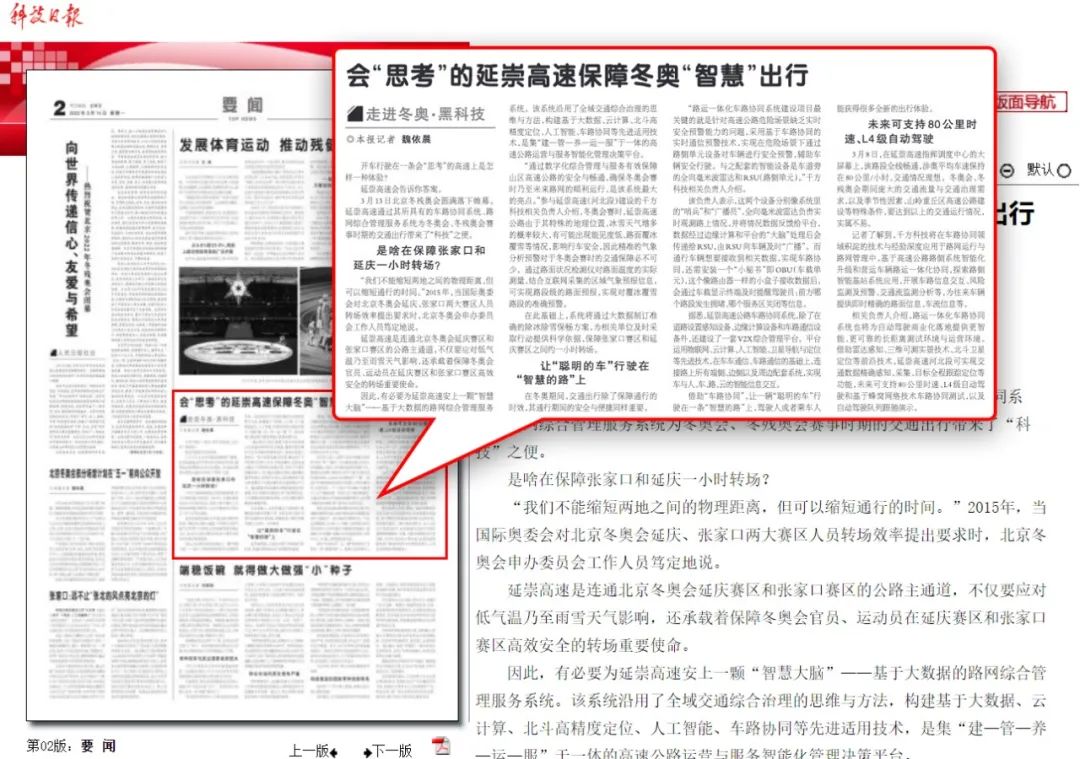 两会期间,中央级新闻媒体科技日报对千方科技保障冬奥“智慧”出行的成功经验进行了重点报道。
