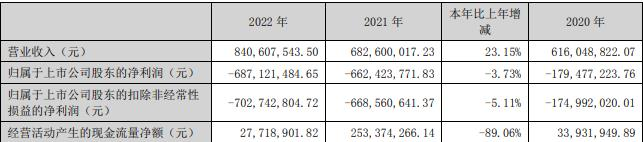 据中锐股份2022年年报,报告期内,公司实现营业收入8.41亿元,同比增长23.15%;归属于上市公司股东的净利润-6.87亿元,同比减少3.73%;归属于上市公司股东的扣除非经常性损益的净利润-7.03亿元,同比减少5.11%;经营活动产生的现金流量净额2771.89万元,同比减少89.06%。