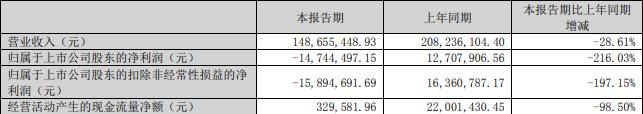 据中锐股份2023年一季度报告,报告期内,公司实现营业收入1.49亿元,同比减少28.61%;归属于上市公司股东的净利润-1474.45万元,同比减少216.03%;归属于上市公司股东的扣除非经常性损益的净利润-1589.47万元,同比减少197.15%;经营活动产生的现金流量净额32.96万元,同比减少98.50%。