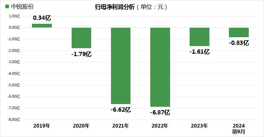 2024年前三季,中锐股份依旧亏损0.83亿元。