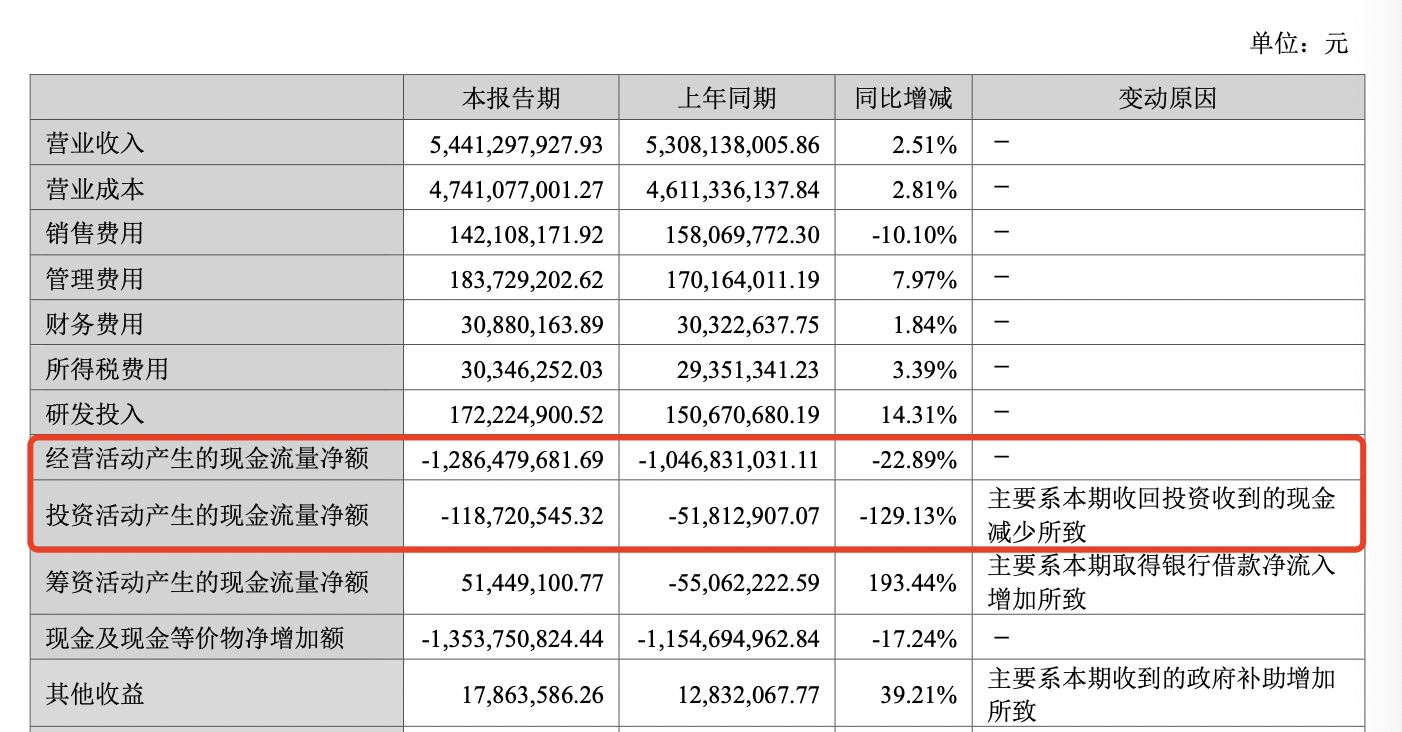 报告期内,亚厦股份的经营活动产生的现金流量净额为-12.86亿元,上年同期为-10.47亿元;投资活动产生的现金流量净额为-1.19亿元,上年同期为-5181万元。