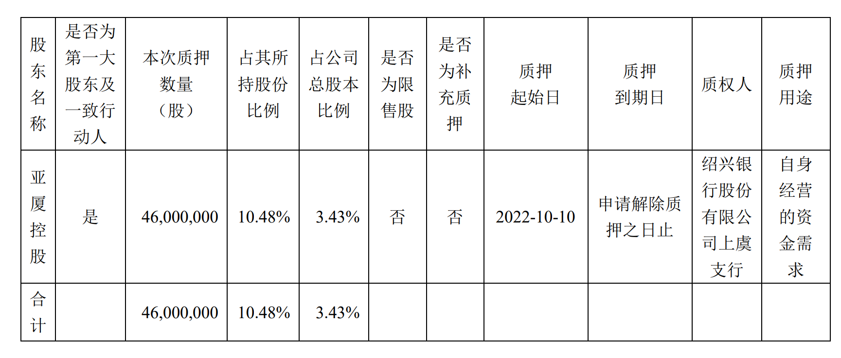 公告显示,亚厦股份于近日接到控股股东亚厦控股有限公司(以下简称“亚厦控股”)的通知,获悉亚厦控股于2022 年10 月10日将其持有的部分4600万股股份办理了股份质押,占亚厦股份总股本比例为3.43%。