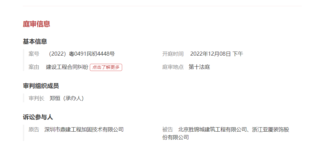 12月6日,浙江亚厦装饰股份有限公司(以下简称“亚厦股份”)近日新增1则开庭公告,案由系建设工程合同纠纷,原告为深圳市鼎建工程加固技术有限公司,被告为北京胜锦城建筑工程有限公司、浙江亚厦装饰股份有限公司。