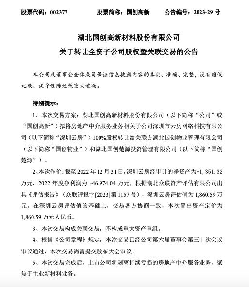5月18日晚间,湖北国创高新材料股份有限公司(以下简称“国创高新”或“公司”)发布关于转让全资子公司股权暨关联交易的公告。公告称,拟将房地产中介服务业务相关子公司深圳市云房网络科技有限公司(简称“深圳云房”)100%股权转让给公司的关联方。本次资产出售完成后,国创高新不再持有深圳云房股权,深圳云房不再纳入国创高新合并报表范围。本次交易完成后,上市公司将剥离持续亏损的房地产中介服务业务,聚焦于主业新材料业务。