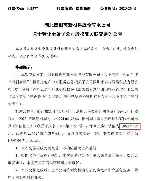 近日,国创高新发布公告,拟将房地产中介服务业务相关子公司深圳市云房网络科技有限公司100%股权转让给公司的关联方。本次资产出售完成后,国创高新不再持有深圳云房股权,深圳云房不再纳入国创高新合并报表范围。