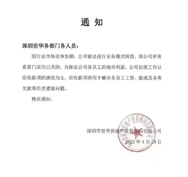 今年5月初,Q房网陷入“倒闭传闻”。一份深圳市世华房地产投资顾问有限公司发布的通知显示,因行业市场竞争加剧,公司被迫进行业务模式转型,现公司所有直营门店均已关闭。为保证公司各员工的相关利益,公司后续工作以应收款项的清收为主,应收款项将用于解决各员工工资提成及各类欠款等历史遗留问题,落款时间2023年4月28日。