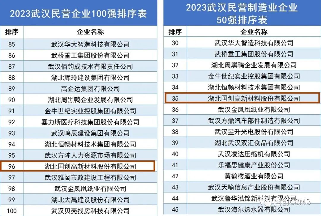 国创高新位列“武汉民营企业100强”第96名,“武汉民营制造业企业50强”第35名。