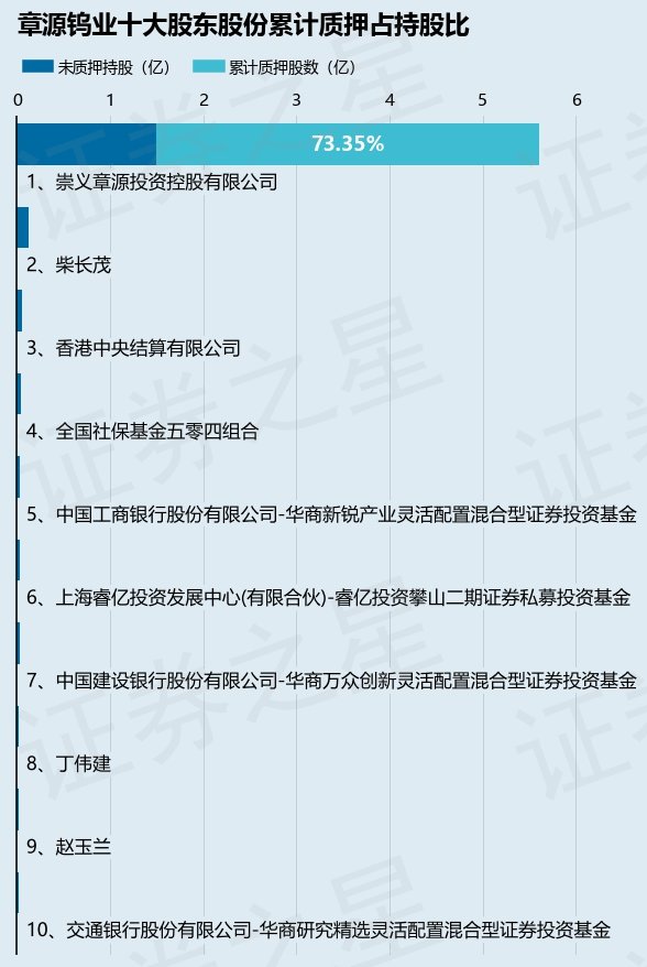 截止本公告日,股东崇义章源投资控股有限公司已累计质押股份4.11亿股,占其持股总数的73.35%。本次质押后章源钨业十大股东的累计质押股份占持股比例见下图: