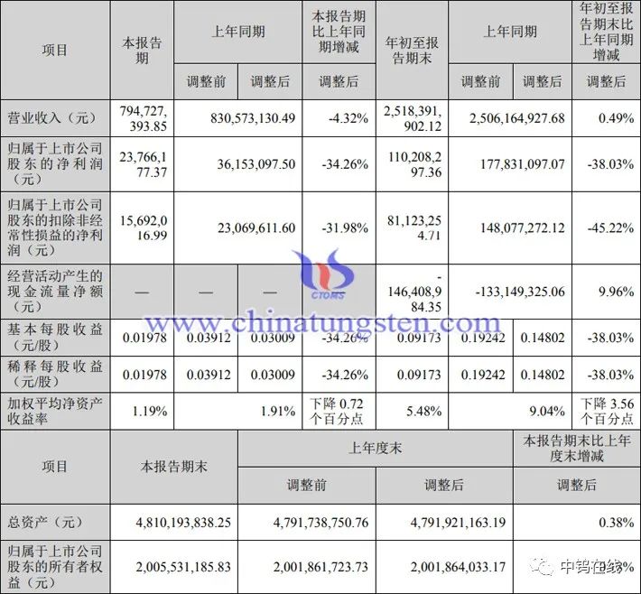 近日,章源钨业发布报告称,公司2023年第三季度实现营业收入7.95亿元,同比下降4.32%;归母净利润2376.62万元,同比下降34.26%;扣非净利润1569.20万元,同比下降31.98%;基本每股收益0.01978元,同比下降34.26%;报告期末,总资产48.10亿元,同比增长0.38%;归母所有者权益20.05亿元,同比增长0.18%。