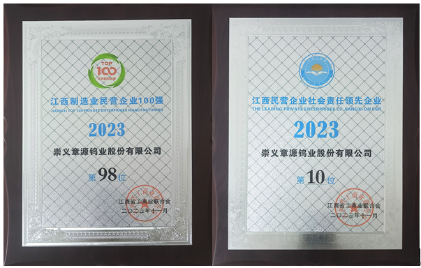 2023年11月3日,由江西省工商联主办的2023江西民营企业100强峰会在南昌举办,公司党委书记、副总经理赖昌洪出席活动并代表公司领奖。会上发布了2023江西民营企业100强榜单、制造业民营企业100强榜单和服务业民营企业20强榜单,同时还发布了2023江西上规模民营企业调研分析报告、江西民营企业社会责任报告。章源钨业以2022年32.03亿元的营收位列江西制造业民营企业第98位,同时位列江西民营企业社会责任领先企业第10位。