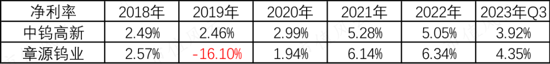 由于章源钨业产品技术含量较低的APT、粉末制品等前端环节收入占比较高导致毛利率较低,所以净利率也相对较低(和中钨高新一样)。