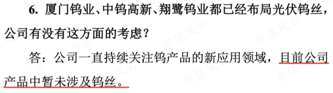 (1)章源钨业产品中连钨丝都没有,更不用说光伏用钨丝;