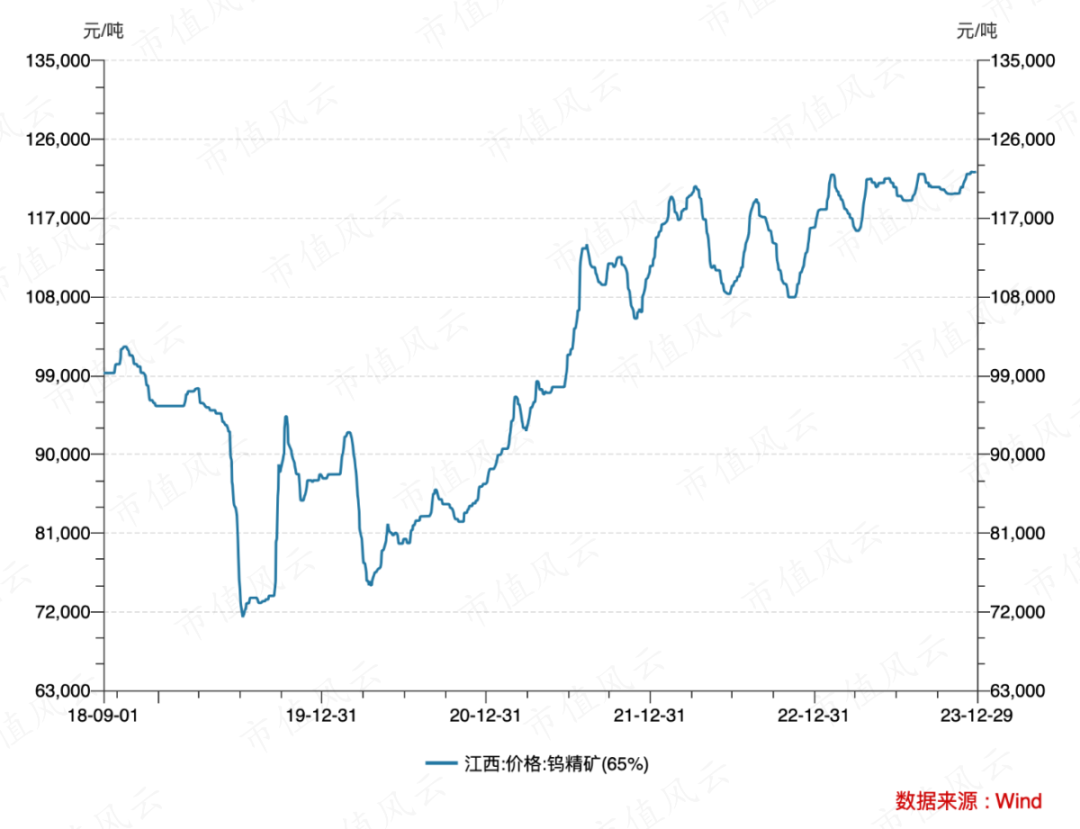 要知道,整个2022年我国硬质合金相关需求和产品产量同比都是下滑的——产量同比下降2.65%,2023年需求更加疲软,但是2022年以来钨精矿价格最近一直稳定在12万/吨以上。