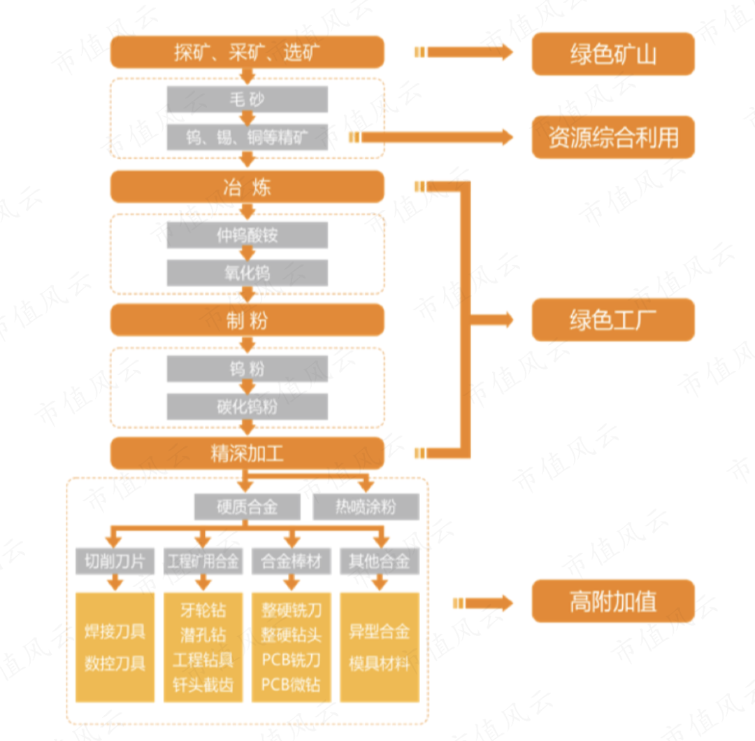 章源钨业建立了从钨上游探矿、采矿、选矿,中游冶炼、制粉,下游精深加工的一体化生产体系,也是国内拥有完整产业链的硬质合金厂商之一,不过产业链高价值的部分在于硬质合金的生产。