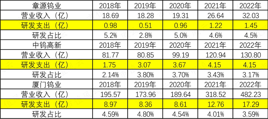 章源钨业的研发支出比例虽然稍高一些,但是绝对值相对较少,2022年章源钨业、中钨高新、厦门钨业的研发支出分别为1.45亿、4.15亿、17.29亿,其中厦门钨业的研发支出已经超过了章源钨业收入的一半。