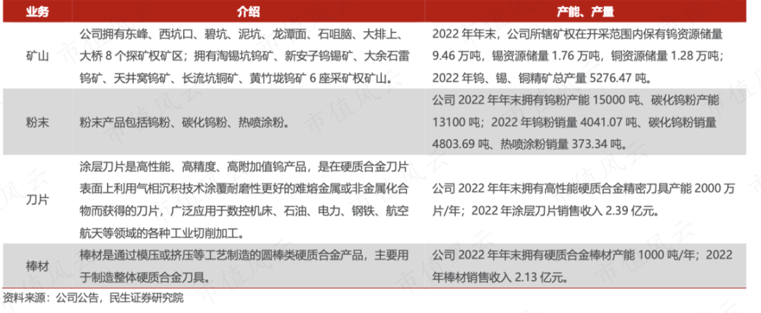 目前拥有钨精矿产能4000余吨、钨粉产能15000吨、碳化钨粉产能13100吨、高性能硬质合金精密刀具产能2000万片/年、硬质合金棒材产能1000吨/年,还有未知储量的锂矿。