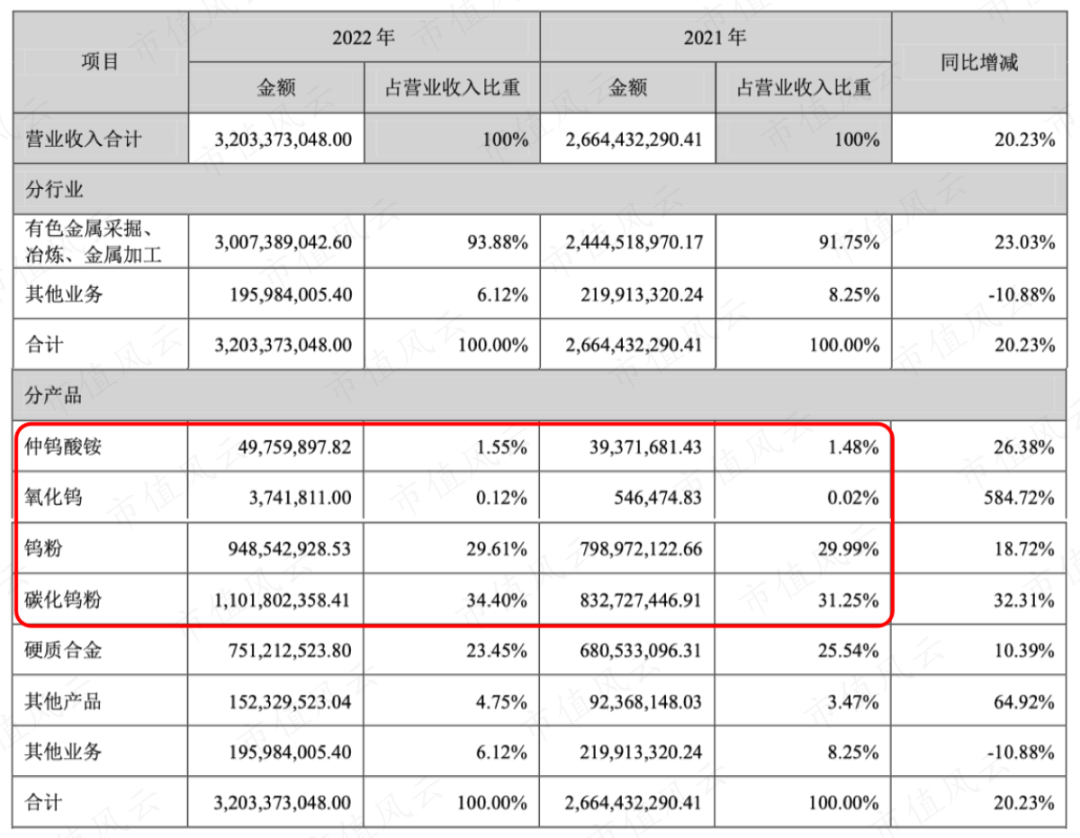 2022年总营业收入32亿,其中主营业务收入为30亿,产业链上游价值较低的产品(仲钨酸铵、氧化钨、钨粉、碳化钨粉)合计收入65%以上,而真正高附加值的硬质合金收入只有7.51亿,占比23.45%。
