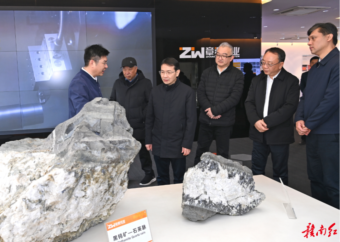 2025年1月15日上午,江西省委常委、统战部部长、赣州市委书记黄喜忠同志到章源钨业调研钨产业高质量发展情况。崇义县委书记李国泉陪同调研,章源钨业董事长黄泽兰和总经理黄世春接待了调研。