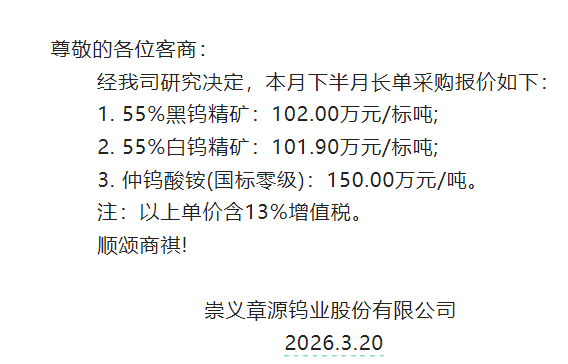据崇义章源钨业3月20日消息:崇义章源钨业股份有限公司3月下半月的长单采购报价如下:1. 55%黑钨精矿:102万元/标吨,较上轮报价上调12万元/标吨;2. 55%白钨精矿:101.9万元/标吨,较上轮报价上调12万元/标吨;3.仲钨酸铵(国标零级):150万元/吨,较上轮报价上调17万元/吨。