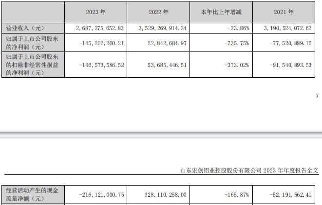 宏创控股2023年年报显示,2023年度,宏创控股归属于上市公司股东的净利润为-1.45亿元,归属于上市公司股东的扣除非经常性损益的净利润为-1.47亿元。