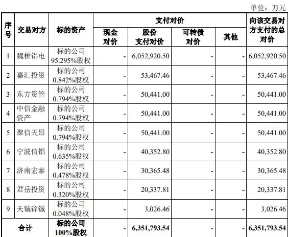 公司12月3日披露的《重大资产重组报告书(上会稿)》显示,本次交易方案为上市公司通过发行股份的方式购买 魏桥铝电 、 嘉汇投资 、东方资管、 中信金融资产 、 聚信天昂 、宁波信铝、济南宏泰、君岳投资、天铖锌铖持有的标的宏拓实业100%股权。本次交易完成后,标的宏拓实业将成为上市公司的全资子公司。