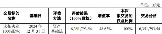 根据 中联评估 出具的《评估报告》(中联评报字[2025]第900号),以资产基础法作为最终评估结论。资产基础法下,标的公司母公司口径账面净资产3,078,576.08万元,合并口径归属于母公司的所有者权益账面值4,273,980.76万元,股东全部权益评估值6,351,793.54万元,相比合并口径归属于母公司的所有者权益账面值评估增值2,077,812.78万元,增值率 48.62%。标的宏拓实业100%股权最终确定本次交易作价金额为6,351,793.54万元。
