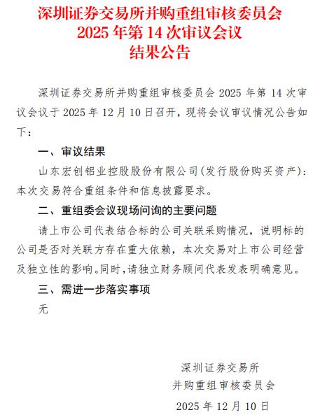 深交易并购重组审核委员会2025年第14次审议会议于昨日召开,会议审议结果显示,山东宏创铝业控股股份有限公司( 宏创控股 ,002379.SZ)发行股份购买资产符合重组条件和信息披露要求。