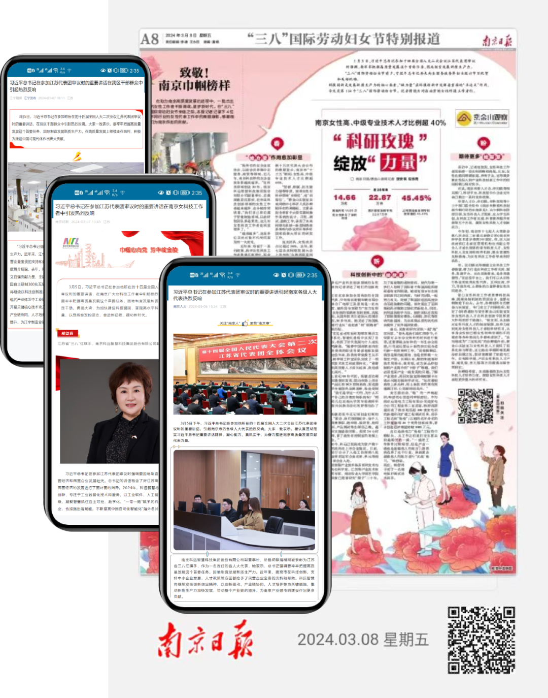 恰逢全国两会,习近平总书记在参加江苏代表团审议时强调要因地制宜发展新质生产力,促进民营经济和民营企业发展壮大。这给予胡歙眉为代表的女性科技创业者极大鼓舞及信心,作为省人大代表,她就如何奋力推进新型工业化发展畅谈感言,受到南京电视台、南京日报、南京人大、南京妇联、紫金山观察、江宁发布等官方媒体重点关注。