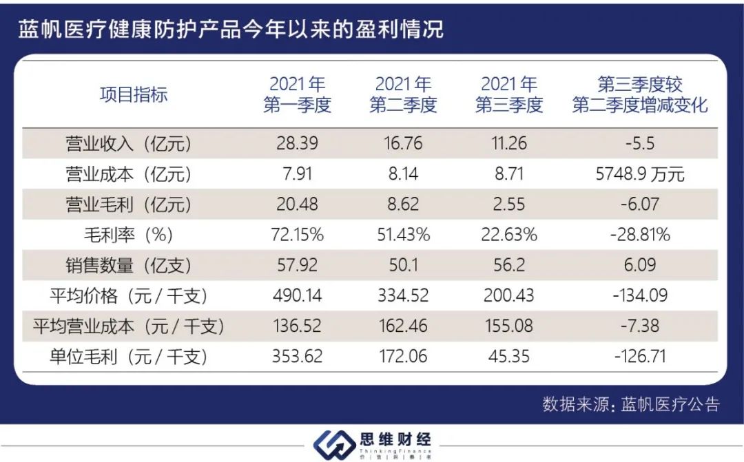 可看出蓝帆医疗第三季度业绩出现亏损,主要是健康防护产品盈利水平第三季度较第二季度进一步下滑、逐步趋近疫情前的正常利润水平所致。
