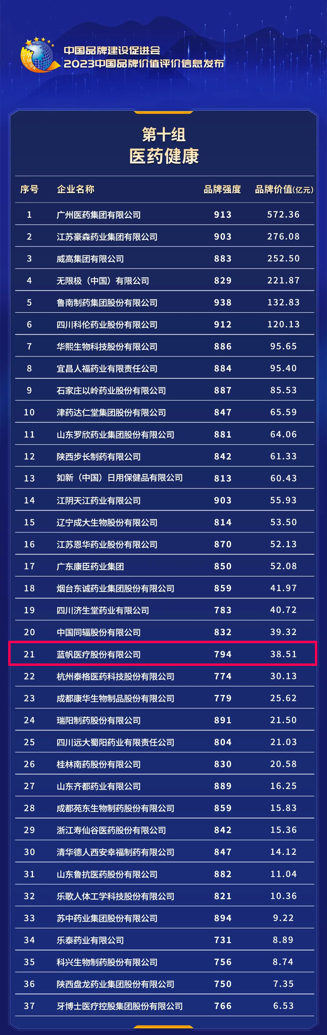 近日,新华社、浙江省人民政府、中国品牌建设促进会、中国资产评估协会等单位联合发布“2023中国品牌价值评价信息”。蓝帆医疗以794的品牌强度、38.51亿元的品牌价值名列医药健康组第21位。