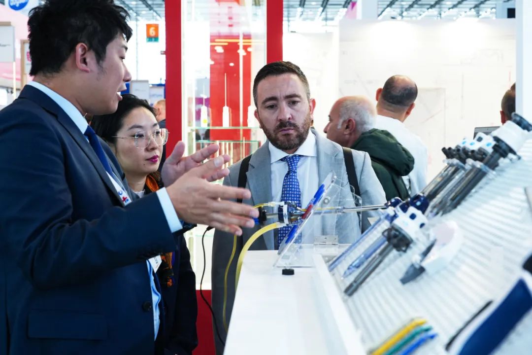 展会期间,蓝帆医疗的展台迎来了世界各地的行业人士参观。嘉宾们对蓝帆医疗各个领域的创新产品表现出了浓厚的兴趣。现场的公司同事与嘉宾们进行了深入的交流。他们不仅详细介绍了产品的特性和优势,还耐心解答了关于技术、市场及合作等方面的问题。这种开放、互动的交流方式,不仅加深了观众们对蓝帆医疗及其产品的了解,也为双方未来的合作奠定了坚实的基础。