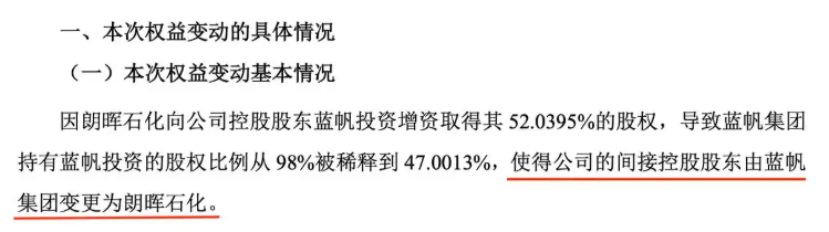 蓝帆医疗5月16日发布公告表示,蓝帆医疗近日收到蓝帆投资通知,获悉蓝帆医疗原控股股东蓝帆集团与朗晖石化等签署了增资协议,朗晖石化以其持有蓝帆投资约10.91亿元的债权作价出资,取得蓝帆投资52.0395%的股权,导致蓝帆集团持有蓝帆投资的股权比例从98%被稀释47.0013%,使得蓝帆医疗的间接控股股东从蓝帆集团变更为朗晖石化。