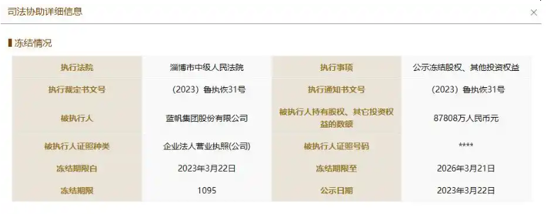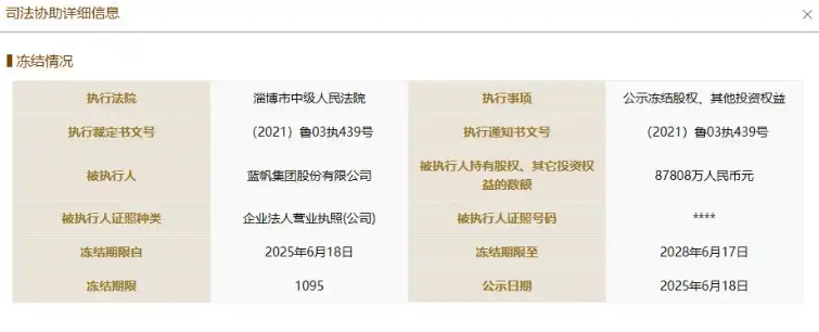 国家企业信用信息公示系统显示,蓝帆集团股份有限公司(下称“蓝帆集团”)持有的蓝帆投资股权被山东省淄博市中级人民法院冻结,被冻结的标的数额为87808万元,冻结日期自2025年6月18日至2028年6月17日。