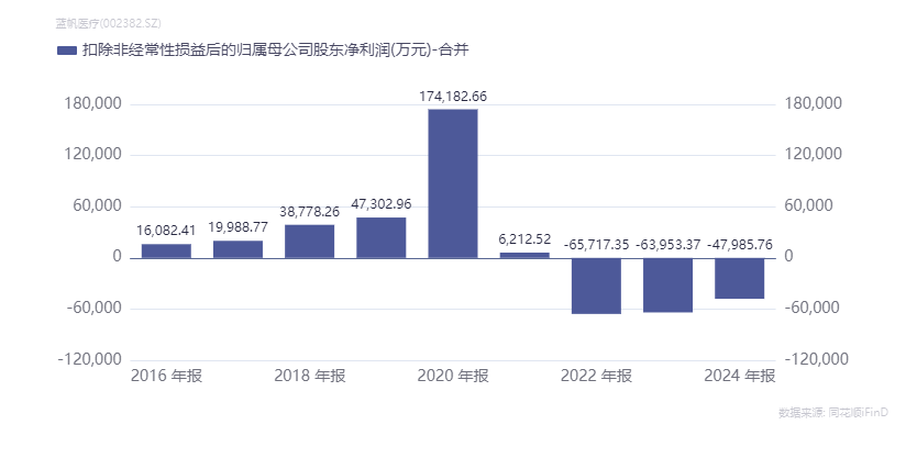 实际上,自2020年、2021年业绩“猛增”之后,蓝帆医疗已连续四年净亏损。2020年至2024年,公司扣非归母净利润分别为17.42亿元、0.62亿元、-6.57亿元、-6.40亿元和-4.80亿元,营收亦从超80亿元规模回落至62.53亿元,2025年亏损进一步扩大。