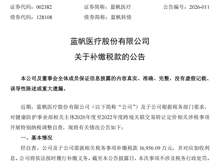 近日,蓝帆医疗股份有限公司(证券代码:002382.SZ,证券简称:蓝帆医疗)公告称,公司及子公司在税务部门要求下,对健康防护事业部相关主体2020年度至2022年度跨境关联交易转让定价相关涉税事项开展特别纳税调整自查,经自查需补缴税款16956.09万元,并对应加收利息。