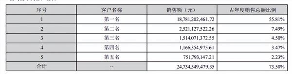 证券之星注意到,在营收节节攀升背后,东山精密也存在收入依赖大客户的问题。根据年报,东山精密第一大客户贡献了超过一半的收入,达到187.81亿元,占总收入的55.81%。而来自前五大客户的收入为247.35亿元,占到了总收入的73.5%。