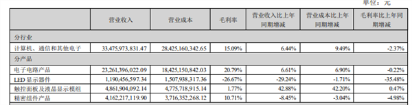 LED显示器件毛利率的下降也导致内销的毛利率同比下降7.96%至4.49%,远高于外销1.38%的降幅。