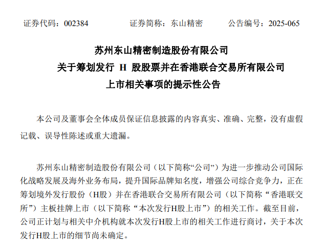 9月23日晚,东山精密公告称,为进一步推动公司国际化战略发展及海外业务布局,提升国际品牌知名度,增强公司综合竞争力,正在筹划境外发行股份(H股)并在香港联交所主板挂牌上市的相关工作。