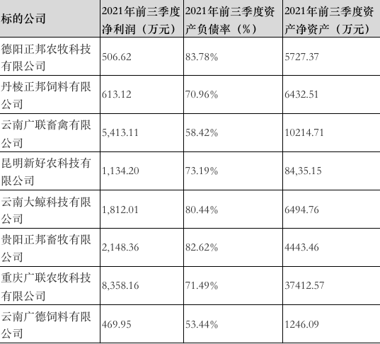 公告还显示,股权转让完成后,以上8个标的公司将不再纳入正邦科技合并报表范围内,将成为大北农的下属控股子公司。标的公司的其他下属子公司及非从事饲料业务的分公司的资产及负债不纳入本次合作范围,由正邦科技予以剥离。