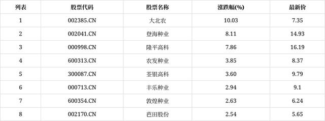 今日午盘,截至13:15,转基因板块拉升。大北农(002385.CN)涨10.03%报7.35元,登海种业(002041.CN)涨8.11%报14.93元,隆平高科(000998.CN)涨7.86%报16.19元,农发种业(600313.CN)涨3.85%报8.37元,荃银高科(300087.CN)涨3.60%报9.79元,丰乐种业(000713.CN)涨2.94%报9.1元,敦煌种业(600354.CN)涨2.63%报6.24元,芭田股份(002170.CN)涨2.54%报5.65元。