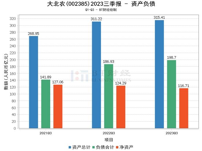 在资产负债方面,大北农2023年三季报显示,公司的总资产为315.41亿元,相比上年度末的312.34亿元有所增长。负债合计为198.7亿元,相比上年度末的182.13亿元增加了16.57亿元,资产负债率从上年度末的58.31%上升到了63%。净资产为116.71亿元,相比上年度末的130.21亿元有所下降。这些变化主要是因为公司对信誉良好、短期资金周转困难的客户增加了欠款额度,预付的货款增加,进行了并购,产生了商誉增加,以及应付票据到期兑付等原因。