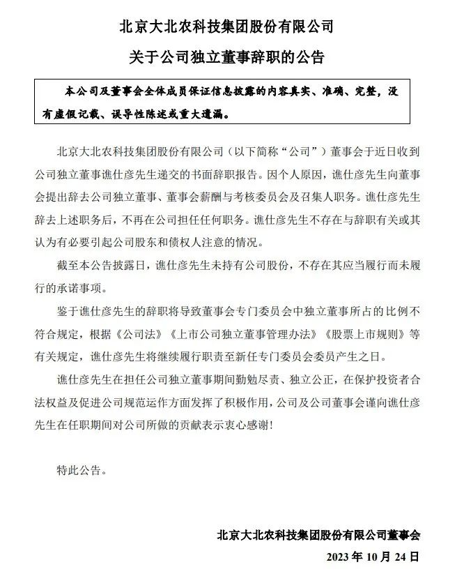 10月24日,大北农(002385)发布公告称,近日收到公司独立董事谯仕彦递交的书面辞职报告。